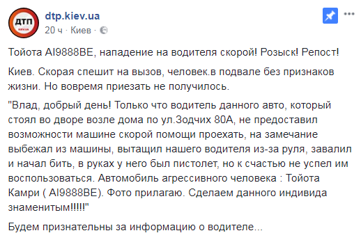 В Киеве на улице Зодчих водитель автомобиля Toyota напал на медиков скорой помощи, которые просили его освободить проезд.