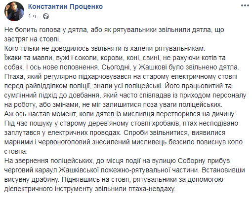 "При поиске в старом деревянном столбе червей птица неожиданно запуталась в электрических проводах. Попытки освободиться оказались напрасными и красноголовый обессиленный охотник повис около столба", - указано в опубликованном сообщении на странице Проценко в среду, 19 сентября.