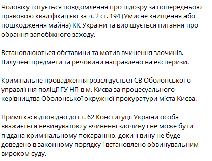 Мужчина находится в Оболонском РОВД ГСЧС в столице. Ему готовятся сообщить о подозрении на основании предварительной юридической квалификации по ч. 2 ст. 194 (умышленное уничтожение или повреждение имущества) УК Украины, также решается вопрос об избрании злоумышленнику меры пресечения..png)