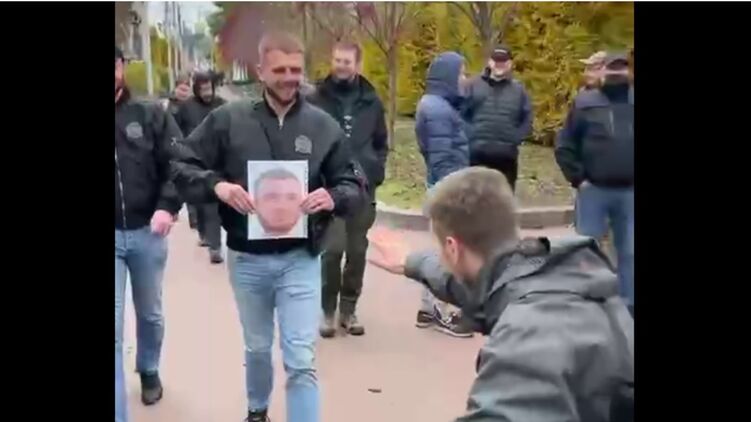 На этой акции провели своеобразный "перфоманс": обвиняемый в убийстве писателя Олеся Бузины Андрей Медведько нес портрет Сергея Бондаря - главы "Муниципальной стражи" Голосеевского района Киева. Другие радикалы кланялись ему и зиговали.