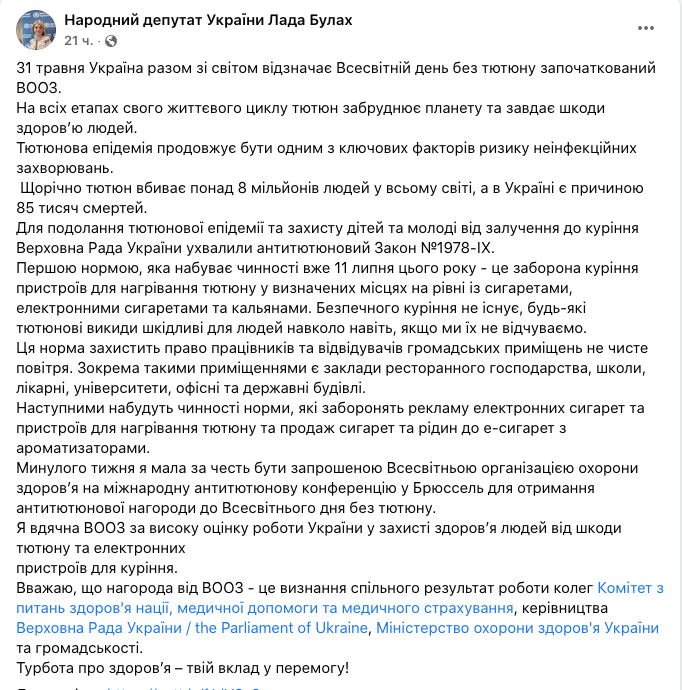 Член медицинского комитета Лада Булах отмечает, что принимали его для преодоления табачной эпидемии и защиты детей и молодежи от привлечения к курению.