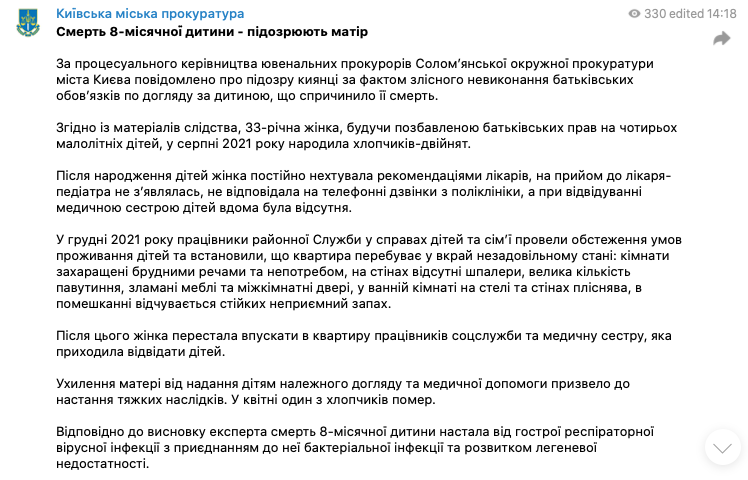 Женщине сообщили о подозрении по ст. 166 УК Украины (злостное невыполнение родителями установленных законом обязанностей по уходу за ребенком, повлекшее тяжкие последствия).