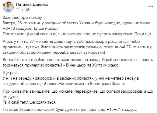 Синоптик Наталья Диденко пишет, что 26 апреля, в западных областях Украины будет холодно, днем не выше +8...+13, дожди. Однако именно эти дожди своей плотной облачностью не пустили заморозки сегодня ночью. Однако ночью 27 апреля, когда облака рассеются, вероятность заморозков реальна в западных областях Украины, а ночью 28 апреля и в Винницкой и Житомирской области.