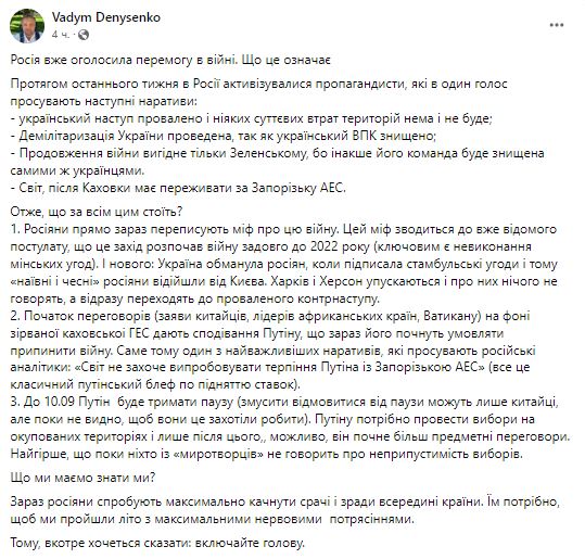 "Сейчас россияне попытаются максимально качнуть срачи и "зрады" внутри страны. Им нужно, чтобы мы прошли лето с максимальными нервными потрясениями. Поэтому еще раз хочется сказать: включайте голову", - написал Вадим Денисенко.