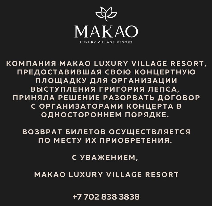"Компания Makao Luxury Village Resort, предоставившая свою концертную площадку для организации выступления Григория Лепса, приняла решение разорвать договор с организаторами концерта в одностороннем порядке. Возврат билетов осуществляется по месту их приобретения", - говорится в сообщении компании.