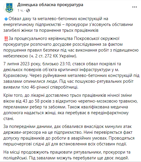 По предварительным данным, крыша обвалилась в результате прошлых атак России на это предприятие. Сейчас проверяется факт допуска работников к работе в аварийных условиях.
