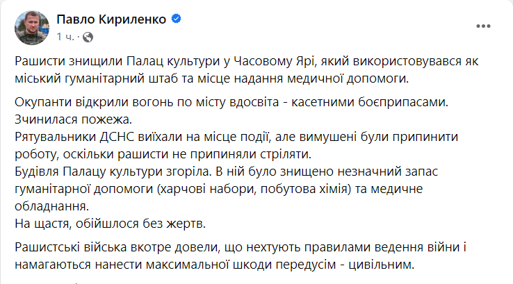 Сегодня утром войска РФ обстреляли Часов Яр Донецкой области кассетными боеприпасами. В результате обстрела сгорело здание Дворца культуры, в котором находились гуманитарный штаб и место оказания медицинской помощи.