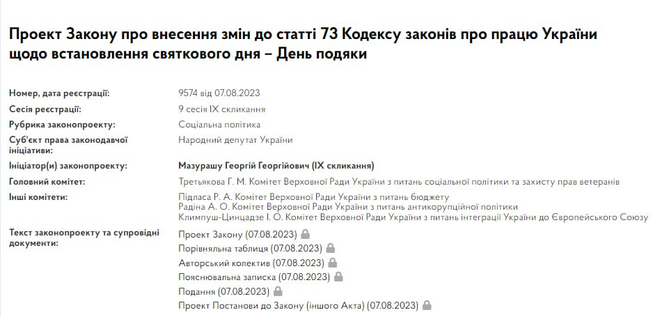 "В условиях полномасштабной вооруженной агрессии Российской Федерации против Украины продолжается мощное возрождение украинской нации. Установление даты празднования Дня благодарения имеет логическую аргументацию: в первую очередь, это поднятие благодарности на общенациональный уровень (как это сделано в некоторых высокоразвитых странах), когда каждый человек получит официальную возможность выразить благодарность всем тем, кому он желает это сделать. Почему именно 22 октября? Осенняя пора, богатая урожаем овощей и фруктов, будет способствовать введению традиции проводить данный праздник за праздничным (семейным) столом. В мире 22 октября отмечают День перемен к лучшему. Праздник National Make A Difference Day посвящен тому, чтобы люди имели возможность совместными усилиями изменить мир к лучшему, помочь окружающим и сделать жизнь лучше, что логично сочетается с идеей Дня благодарения", - сказано в пояснительной записке к проекту.