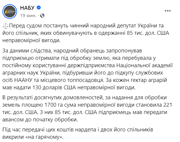 Об этом сообщает НАБУ.