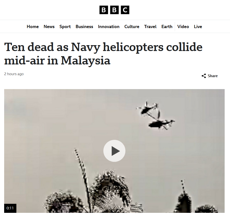 В Малайзии на репетиции военного парада столкнулись два вертолета, погибли 10 человек. Видео момента крушения