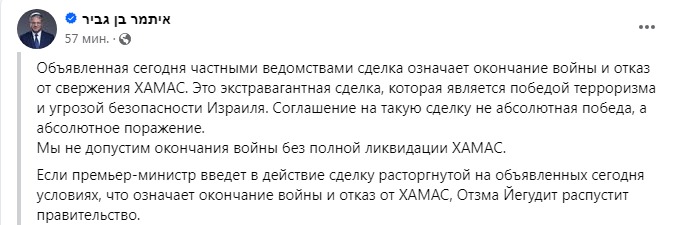 Так, министр национальной безопасности Итамар Бен-Гвир написал, что его партия "Оцма Йехудит" в случае принятия предложения "распустит правительство".