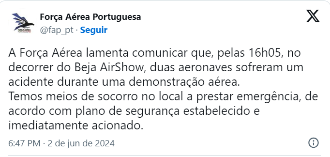 Португальский пилот, которому удалось совершить вынужденную посадку после столкновения двух самолетов, получил ранения. Он был доставлен в больницу Бежа "в качестве меры предосторожности".
