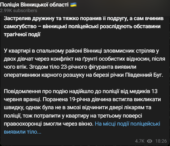 В Виннице 23-летний парень во время ссоры застрелил свою 18-летнюю жену и тяжело ранил ее 19-летнюю подругу. Сам стрелок после этого пошел на набережную, где покончил с собой.