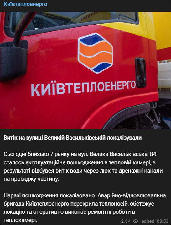 В "Киевтеплоэнерго" сообщают, что утечку на улице Большой Васильковской локализовали.