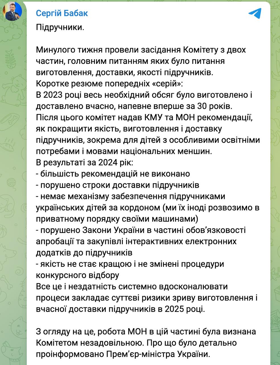 "Нарушены сроки доставки учебников. Нет механизма обеспечения учебниками украинских детей за границей. Нарушены законы Украины в части обязательности апробации и закупки интерактивных электронных приложений к учебникам. Качество не становится лучше и не изменены процедуры конкурсного отбора", - написал Бабак.