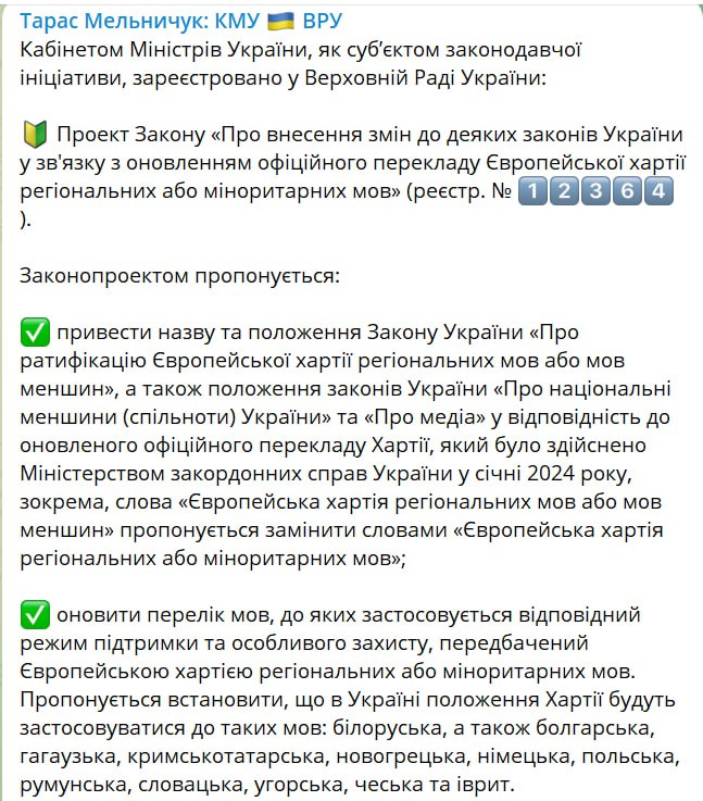Это следует из проекта закона об обновлении официального перевода Европейской хартии региональных и миноритарных языков, сообщение о котором публикует представитель Кабмина в Раде Тарас Мельничук.