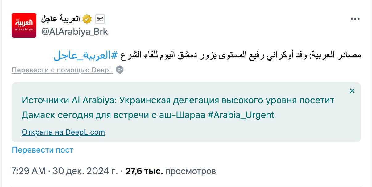 Между тем Al Arabiya со ссылкой на источники сообщает, что высокопоставленная украинская делегация сегодня встретится с Аш-Шараа в Дамаске.