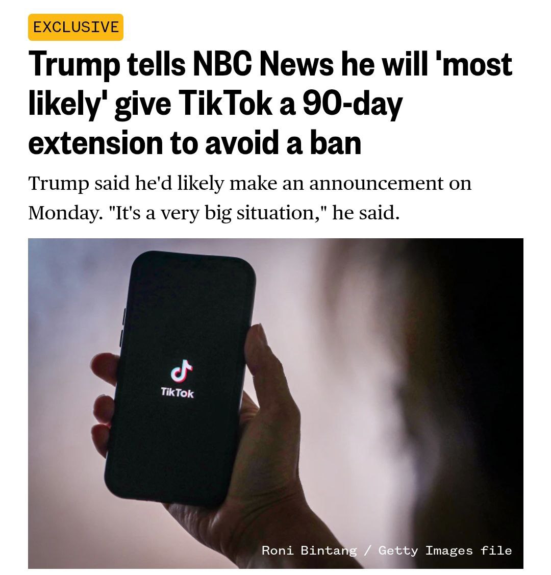 Между тем Дональд Трамп в комментарии NBC News уже заявил, что после своей инаугурации "скорее всего" предоставит соцсети ТикТок 90-дневную отсрочку от запрета в США.