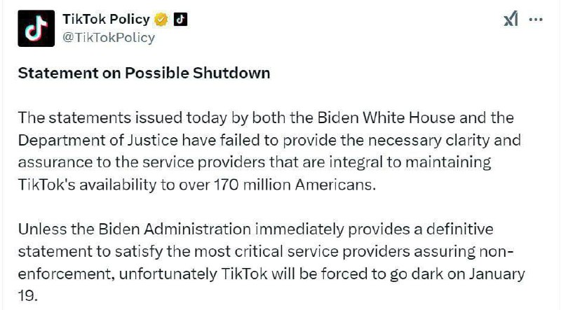 "Опубликованные сегодня заявления Белого дома и министерства юстиции не были достаточно ясными и не содержали гарантий для поставщиков услуг, чья работа необходима для того, чтобы ТикТок оставался доступен для более чем 170 млн американцев. Если администрация Байдена не выступит немедленно с четким заявлением, которое устроит основных поставщиков услуг и гарантирует неисполнение закона, ТикТок будет вынужден прекратить работу 19 января", - заявляет компания.
