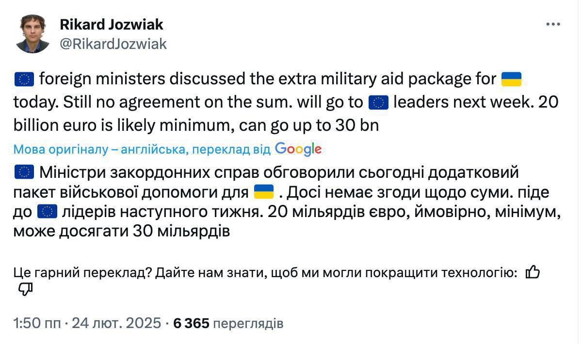 Тем временем министры иностранных дел ЕС обсудили выделение Украине еще 20-30 миллиардов евро военной помощи, сообщил журналист "Радио Свобода" Рикард Йозвяк.