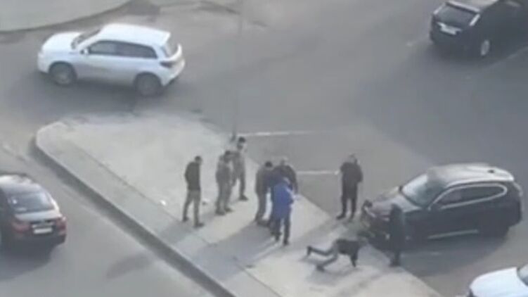 После столкновения гражданского с автомобилем военкомы догнали его, но и после этого мужчина пытается уйти от них на четвереньках.