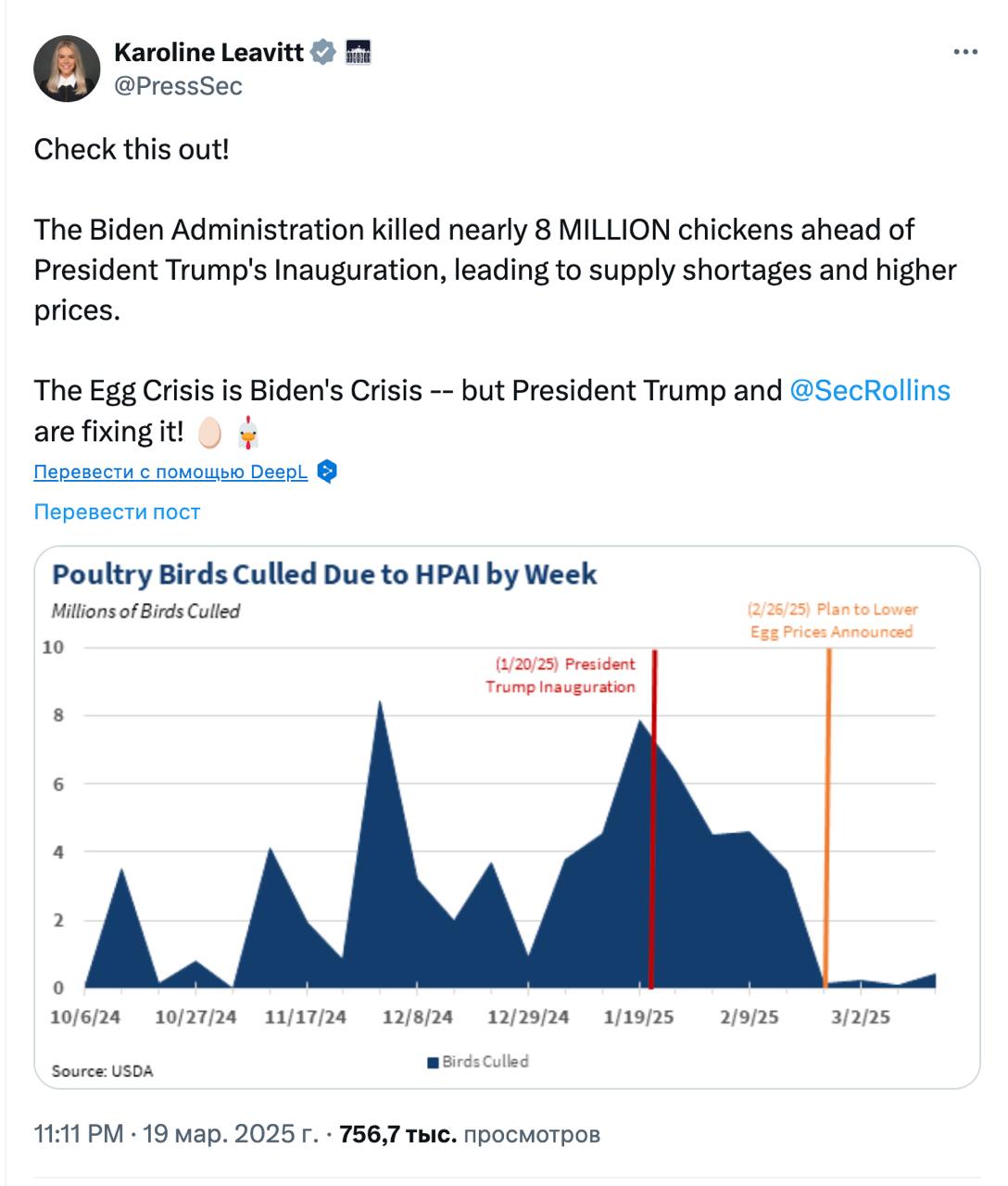 "Администрация Байдена убила почти 8 миллионов кур в преддверии инаугурации президента Трампа, что привело к дефициту и росту цен. Яичный кризис - это кризис Байдена, но президент Трамп и министр сельского хозяйства Брук Роллинз решают эту проблему!" - заявила Левитт, прикрепив некий график.