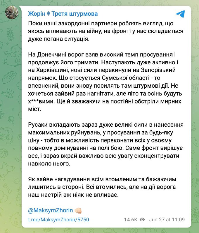 "Не хочется лишний раз нагнетать, но лето и осень будут х***выми. Еще и учитывая постоянные обстрелы мирных городов", - пишет Жорин.