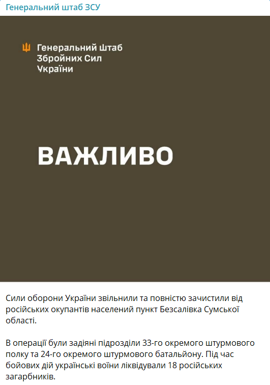 11:06 Силы обороны Украины освободили и полностью зачистили от российских оккупантов населенный пункт Бессалевка Сумской области, сообщает Генштаб ВСУ.