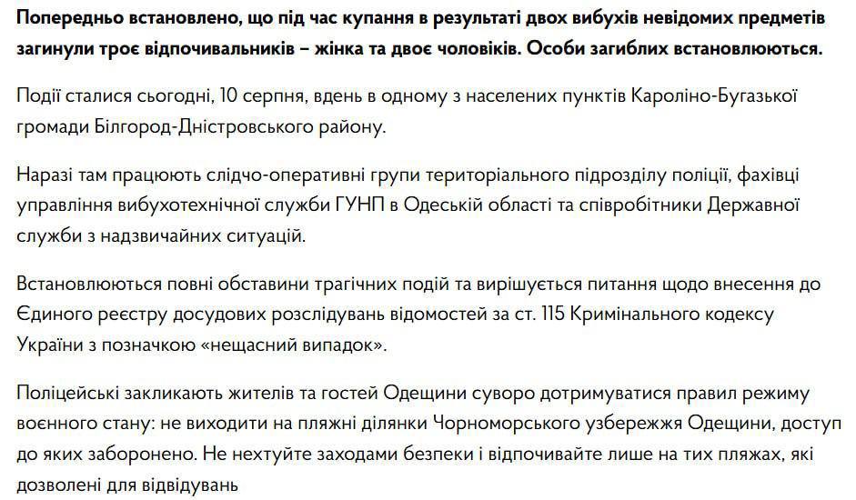 13:10 В Затоке, в результате взрыва двух мин есть трое погибших - женщина и двое мужчин, сообщает полиция.