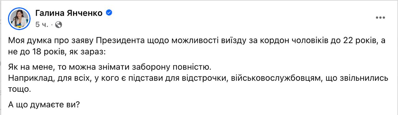 "На мой взгляд, можно полностью снять запрет. Например, для всех, у кого есть основания для отсрочки, освобожденных военнослужащих и т.д.", - пишет Янченко.