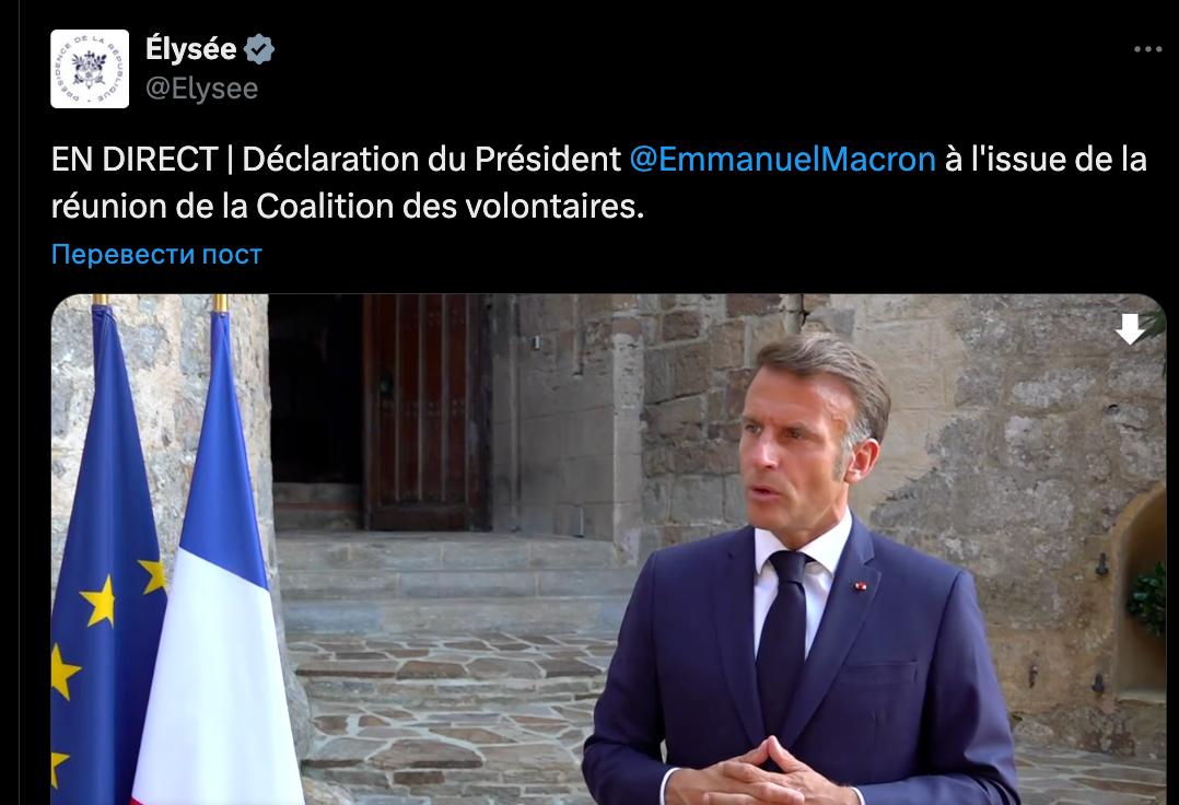 "Ни одна страна не может принять потерю территорий, если у неё нет гарантий безопасности для оставшейся территории", - заявил французский президент после встречи "коалиции желающих".