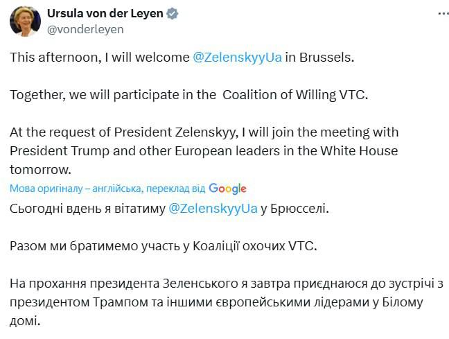 13:16 Завтра вместе с Зеленским на встречу с Трампом в Вашингтон полетят глава Еврокомиссии Урсула фон дер Ляйен, канцлер Германии Мерц, президент Финляндии Стубб, премьер Италии Мелони и генсек НАТО Рютте.