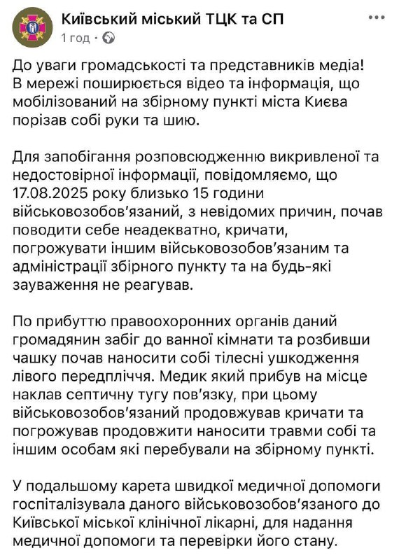 17.46 Киевский ТЦК подтверждает, что вчера днем мобилизованный порезал себе вены. Судя по сообщению, его жизни ничего не угрожает.