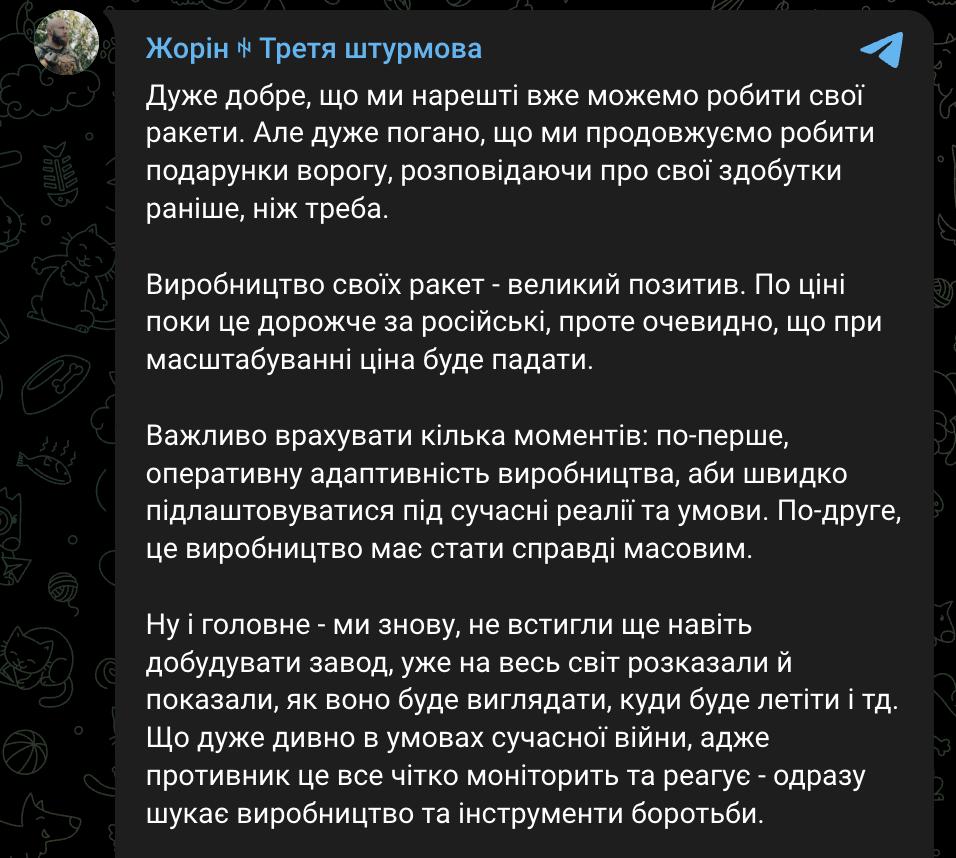 "Мы снова, еще не успели достроить завод, уже на весь мир рассказали и показали, как это будет выглядеть, куда будет лететь и так далее. Что очень странно в условиях современной войны, ведь противник всё это тщательно отслеживает и реагирует - сразу ищет производство и инструменты для противодействия", - написал представитель 3-й штурмовой бригады Жорин.