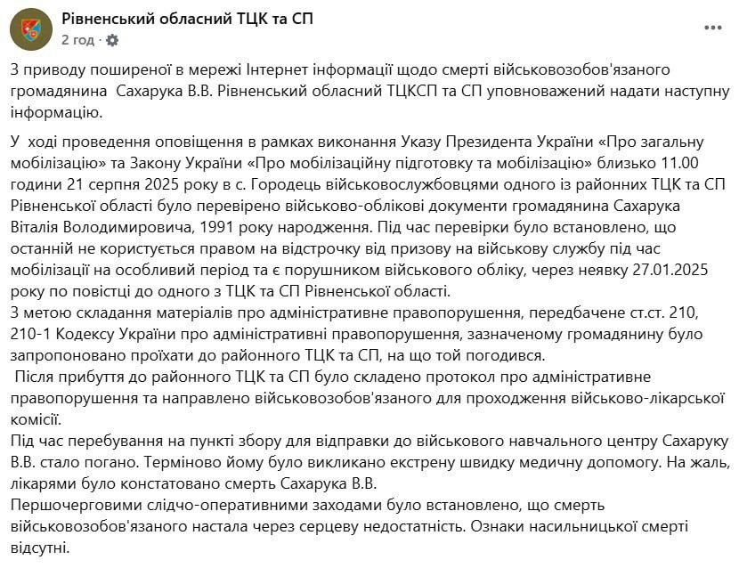 15:13 Ровенский ТЦК заявляет, что мобилизованный Виталий Сахарук погиб из-за сердечной недостаточности после успешно пройденной ВВК, и его не били.