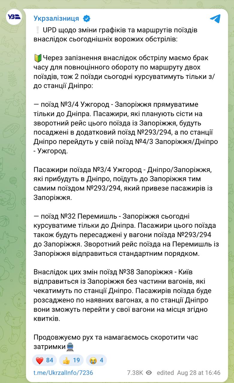 17:00 Два поезда на Запорожье - из Ужгорода и Перемышля - сегодня будут курсировать только до Днепра и за ночной атаки, сообщает Укрзализныця.