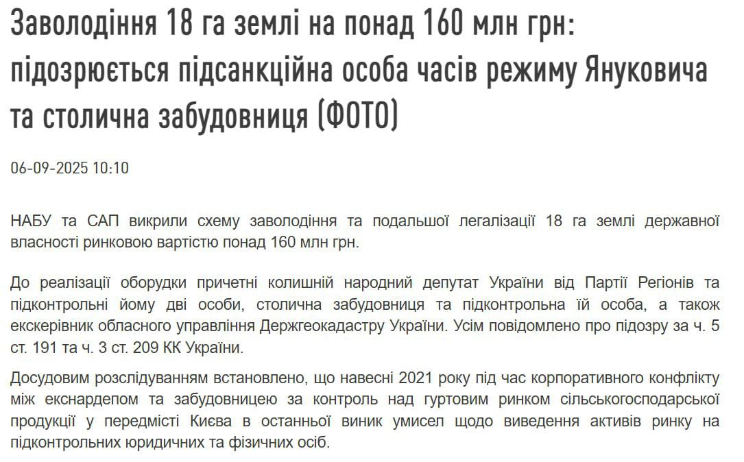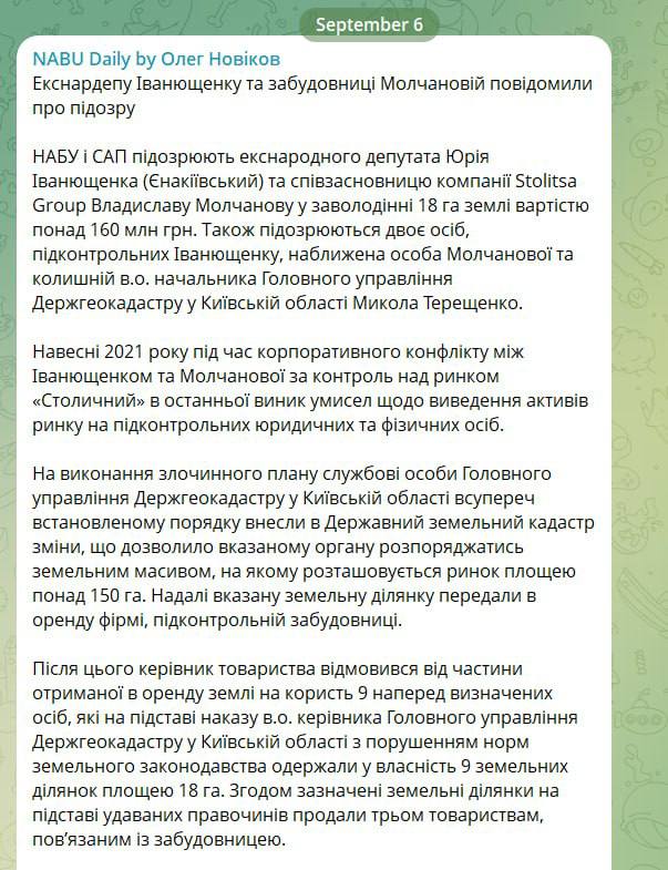 13.17 НАБУ выдвинула подозрение экс-нардепу Юрию Иванющенко и известной киевской бизнесвумен Владе Молчановой по обвинению в присвоении 18 гектар земли стоимостью более чем 160 млн гривен.