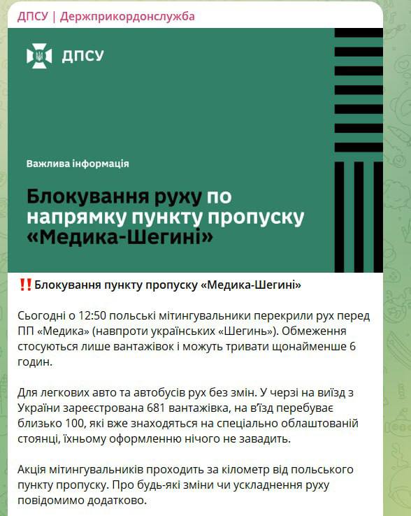 По заявлению службы, поляки перекрыли пункт пропуска "Медика-Шегини". Акция проходит в километре от пункта пропуска. Ограничения касаются только грузовиков и могут продлиться около шести часов.