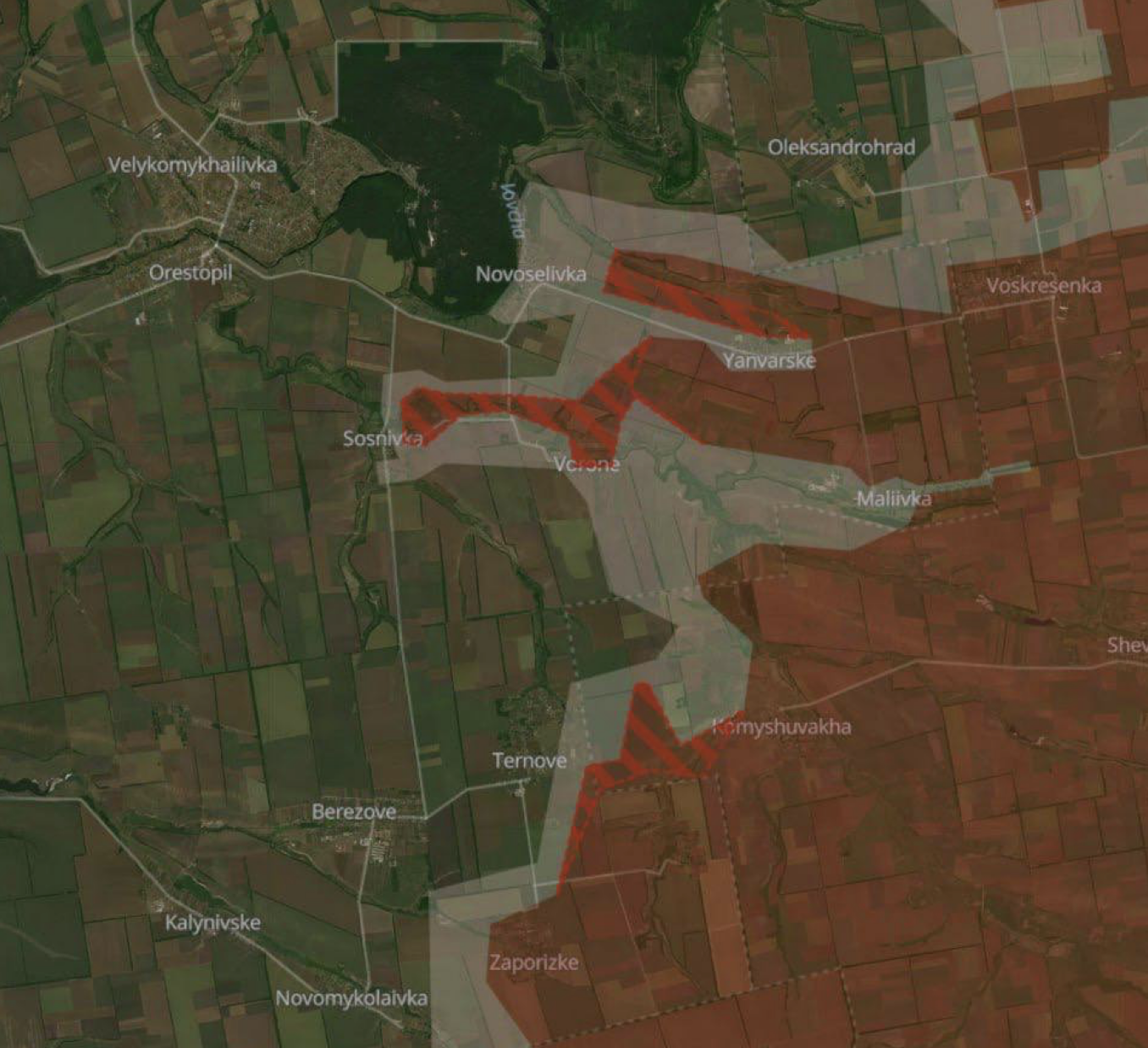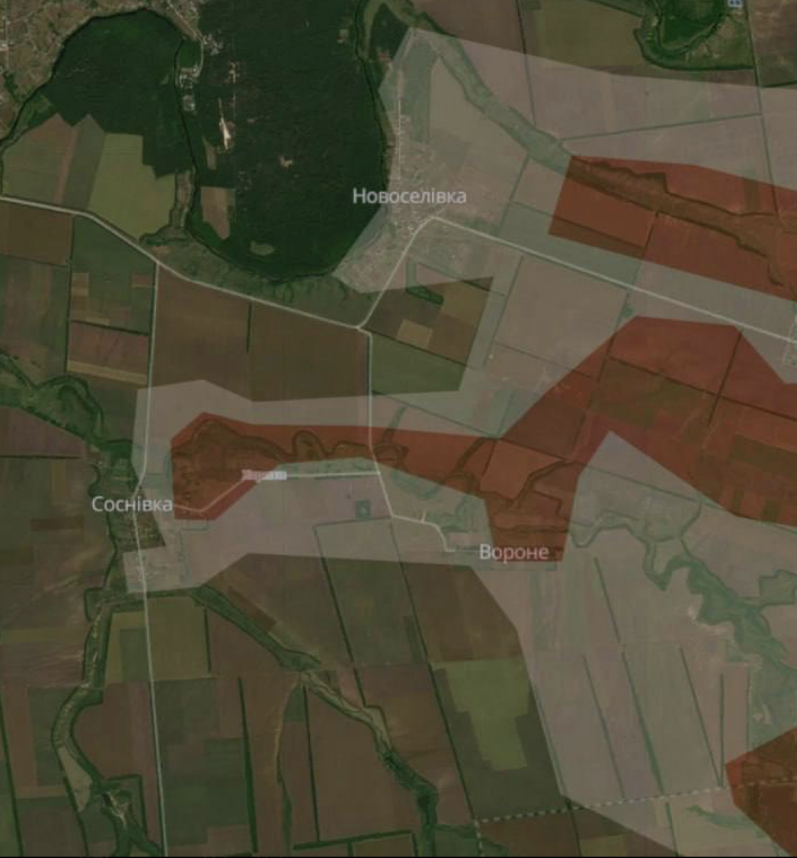 Этот населенный пункт находится между Сосновкой и Вороным. О продвижении на этом направлении россиян сегодня сообщал украинский военный паблик Deep State. На карте паблика село частично в серой зоне, частично под контролем РФ.