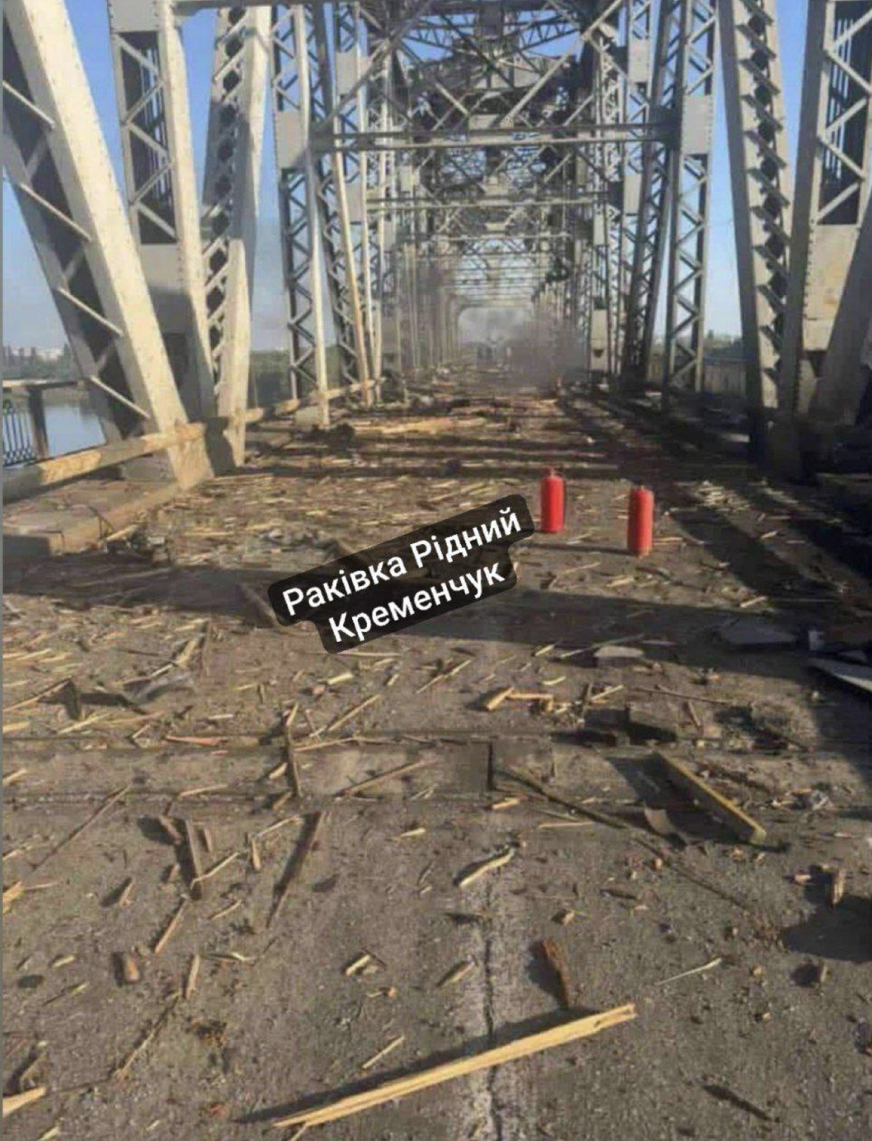 12:45 Член набсовета Укрзализныци и советник Офиса президента Сергей Лещенко перепубликовал в своем телеграмм-канале сообщение об ударе российского дрона по железнодорожному мосту в Кременчуге с видео удара и с фото последствий.