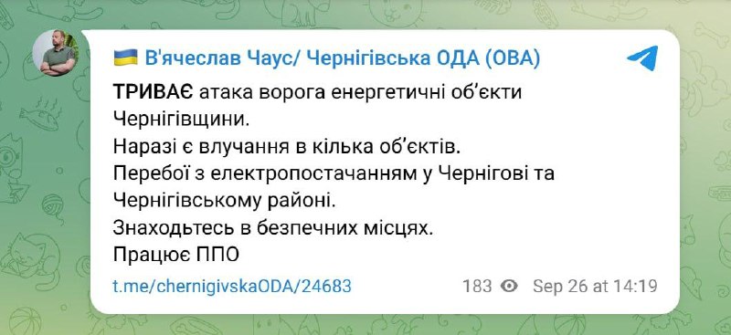 14.27 В Чернигове перебои со светом после прилетов, пишут местные телеграм-каналы.