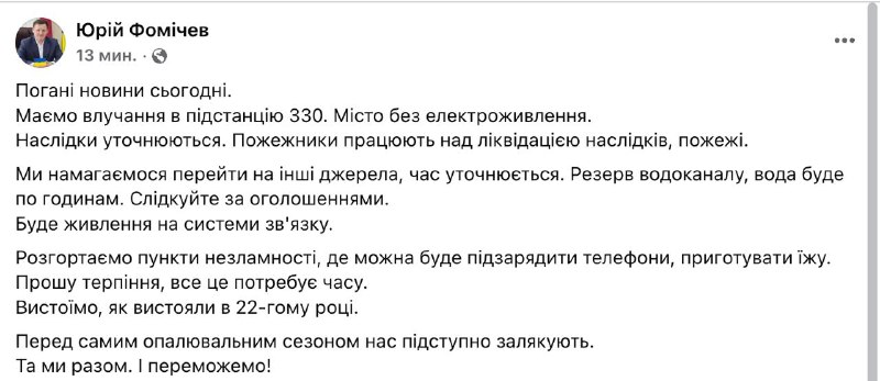 Ранее мэр Славутича Киевской области сообщил , что город обесточен после прилета по подстанции.