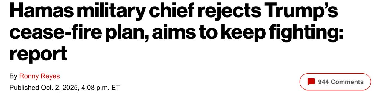 Высший военный лидер ХАМАС отверг мирный план США. Трамп пригрозил уничтожением