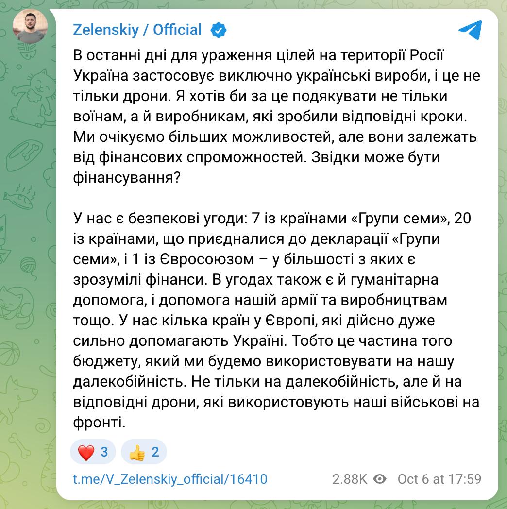 "В последние дни для поражения целей на территории России Украина применяет исключительно украинские изделия, и это не только дроны. Я хотел бы за это поблагодарить не только воинов, но и производителей, которые сделали соответствующие шаги. Мы ожидаем больше возможностей, но они зависят от финансовых возможностей", - пишет президент.