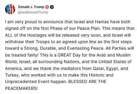 Израиль и ХАМАС подписали первый этап мирного соглашения - Трамп