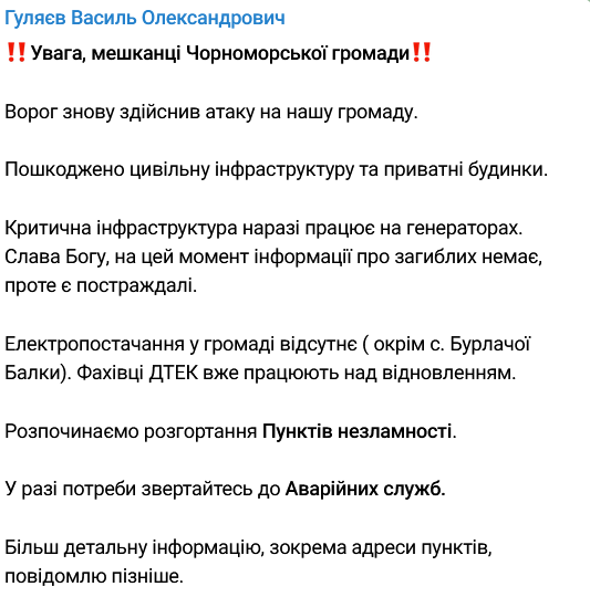 Мэр Черноморска Василий Гуляев сообщил в своем телеграм-канале, что электроснабжения в общине нет, кроме поселка Бурлачья Балка. В городе начинают разворачивать пункты несокрушимости. Критическая инфраструктура города работает на генераторах.
