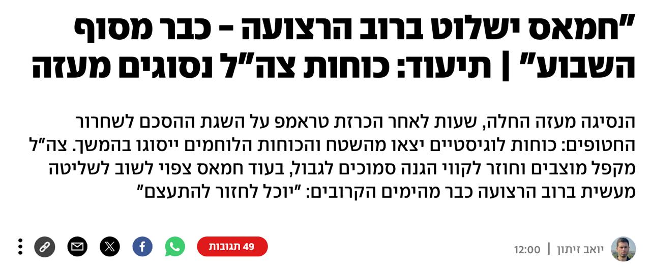 Военные источники заявили журналистам, что "к концу этой недели ХАМАС восстановит контроль над большей частью сектора Газа, и, безусловно, над городскими районами". Также ХАМАС получил гарантии от посредников, включая США, что Израиль не возобновит боевые действия в секторе Газа.