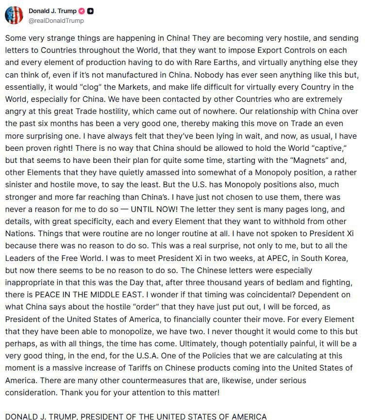 "В Китае происходят очень странные вещи! Они становятся крайне враждебными и рассылают письма странам по всему миру, заявляя, что хотят ввести экспортный контроль на каждый элемент производства, связанный с редкоземельными металлами, и практически на всё остальное, что им только придёт в голову, даже если это не производится в Китае. Никто никогда не видел ничего подобного, но, по сути, это "заблокировало" бы рынки и сделало бы жизнь крайне трудной практически для каждой страны мира, особенно для самого Китая.