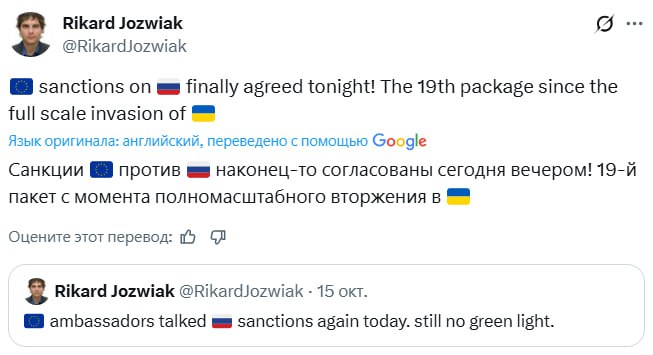 "Санкции ЕС против России, наконец, были согласованы сегодня вечером! 19-й пакет с момента полномасштабного вторжения в Украину", – написал он.
