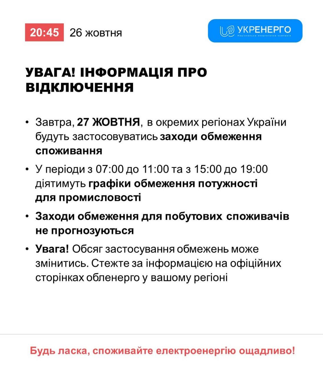 22:22 Завтра в Украине отключать свет у бытовых потребителей не будут, сообщает "Укрэнерго".